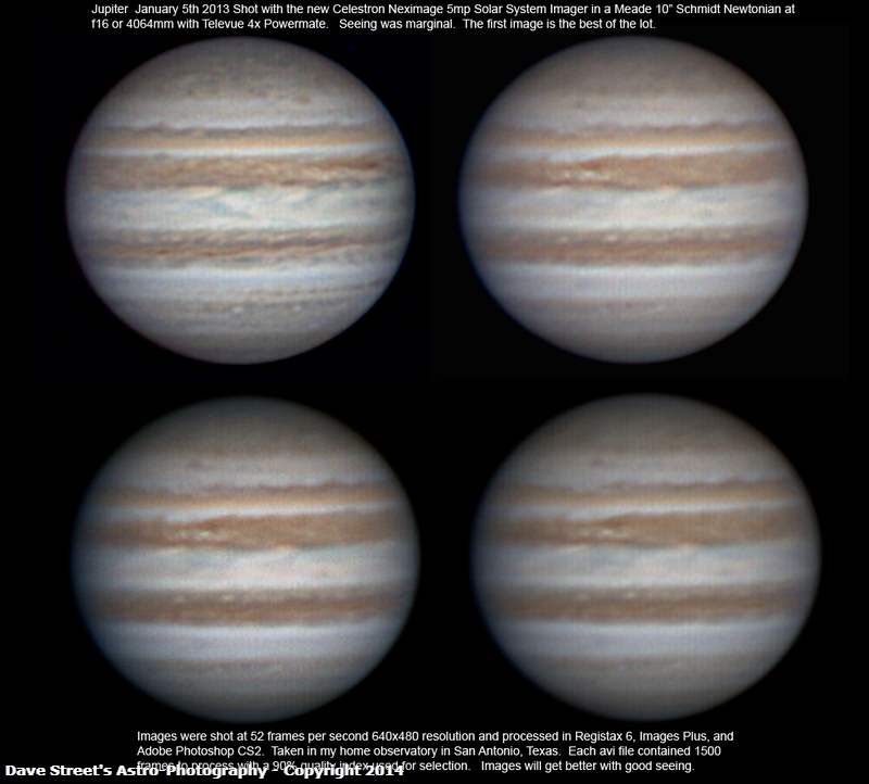 This is Jupiter 01/04/13 shot with Meade SN10 Telescope with a Televue Powermate 4x