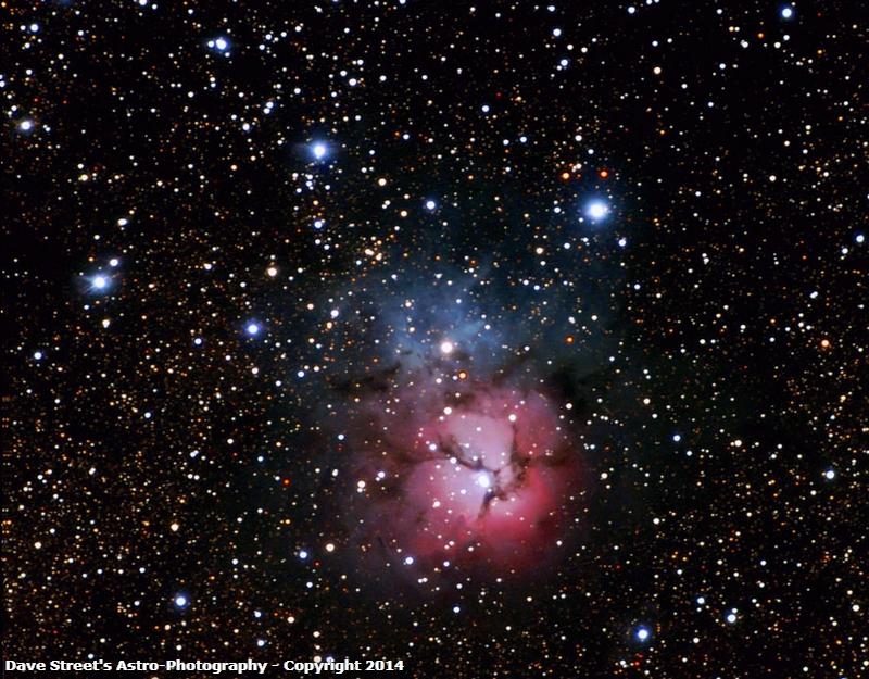M20 Trifid Nebula, shot from Balmorhea West Texas 06/12/05, Camera: Starlight Xpress HX916, Scope: Orion 80ED f7.5, L = 30x3min, Binned 1x1, RGBs 10x2min = Binned 1x1 Captured with MaximDL, Processed in Images Plus and Photoshop