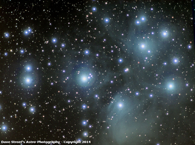 M45 the Pleades Star Cluster, shot at Big Bend National Park, TX 11/04/05, Camera: Starlight Xpress HX916, Scope: Takahashi FS60c on Astro-Physics 900 QMD mount,LRGB = L=20x3min, RGB =10x3min, Autoguided with DSI Pro in NP101, Captured with MaximDL, Processed in Images Plus and Photoshop.