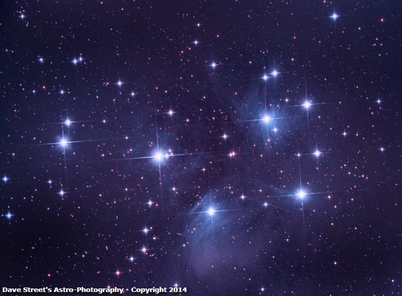 M45 The Pleiades Star Cluster is located in constellation Taurus. It is made up of hot B-Type Stars