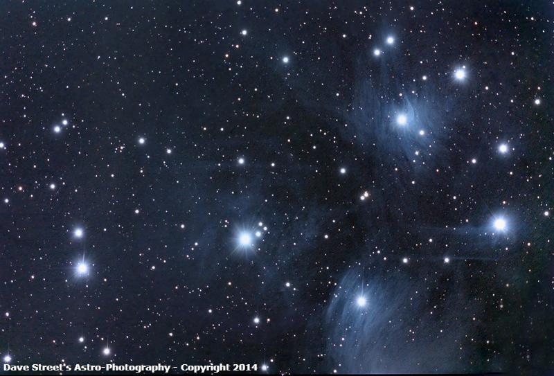 M45 The Pleiades Star Cluster is located in constellation Taurus. It is made up of hot B-Type Stars